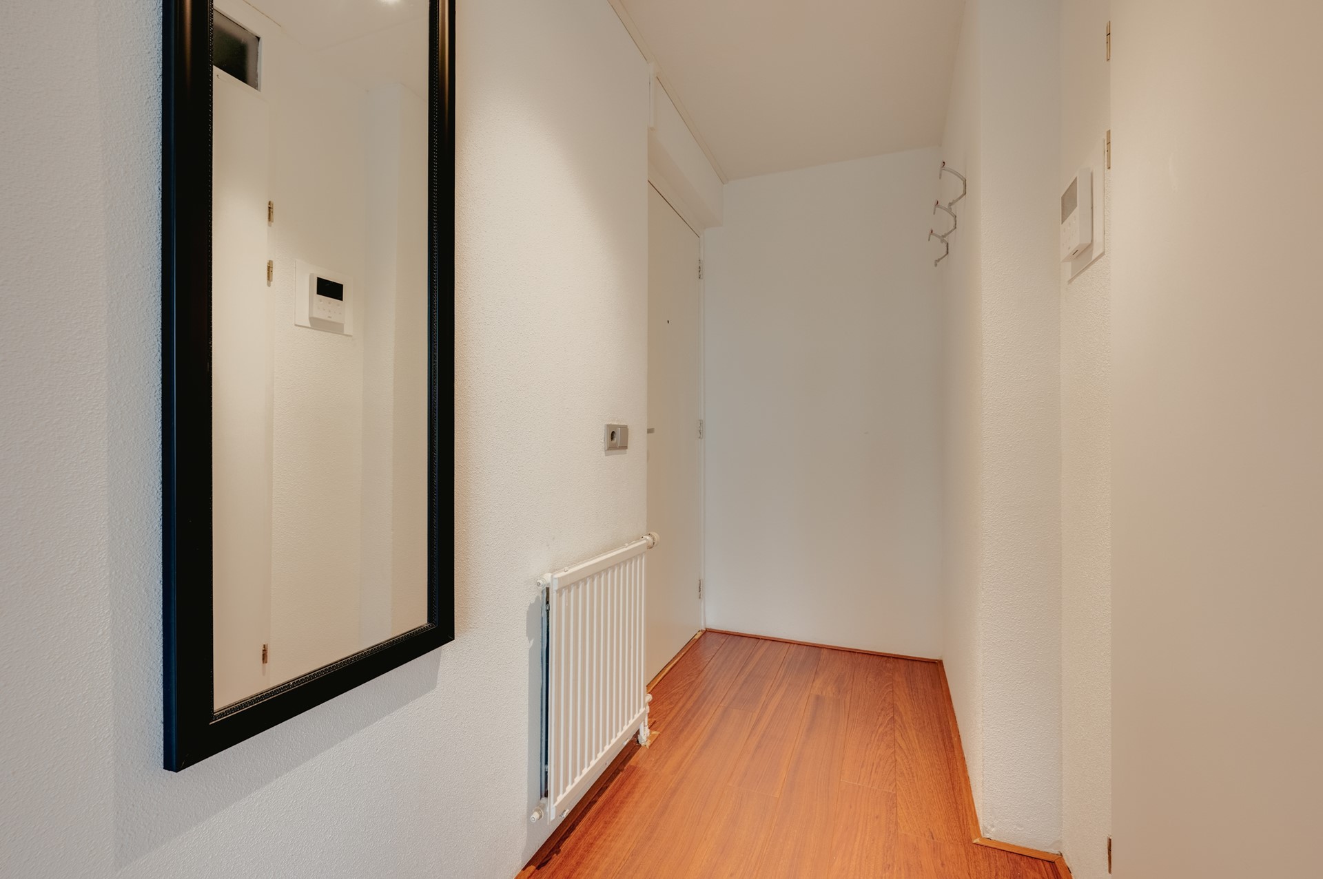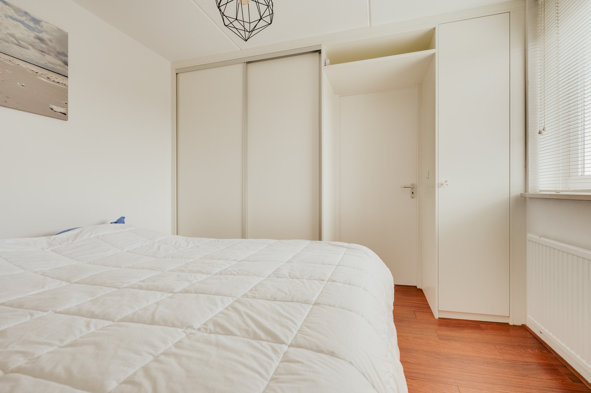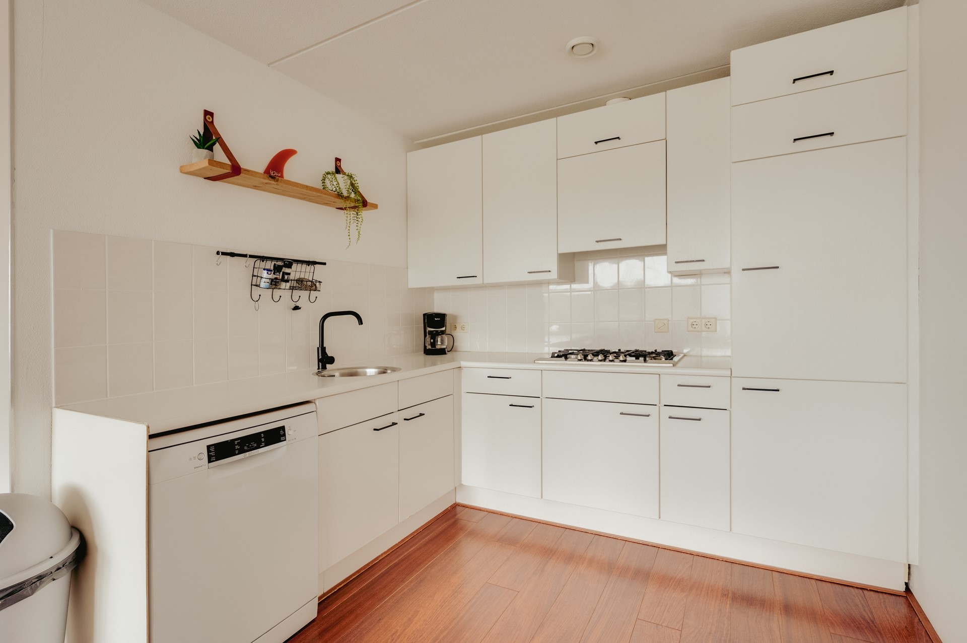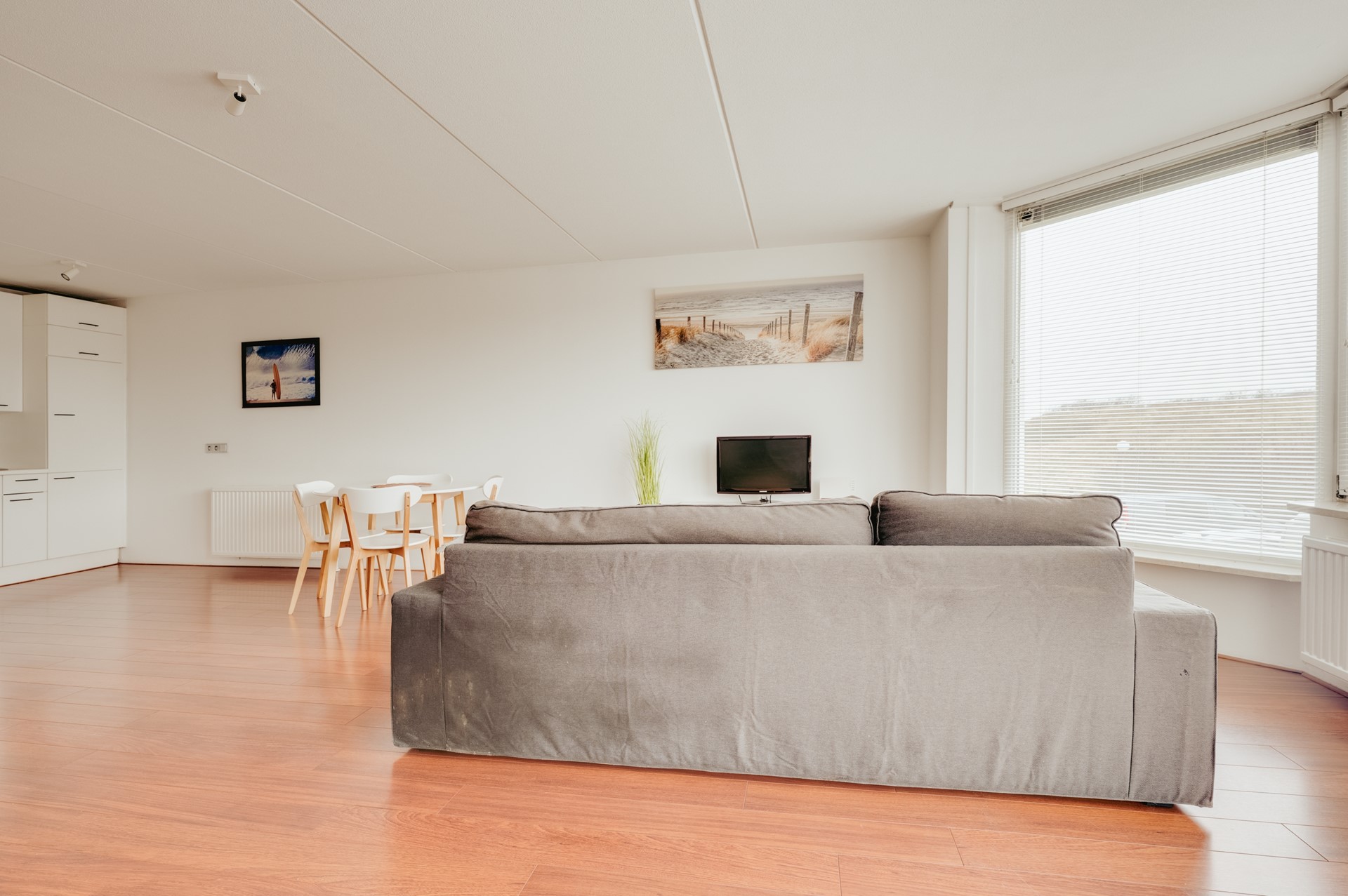 Dit lichte en netjes onderhouden appartement beschikt over een verrassend ruime woonkamer met karakteristieke erker. Dankzij de grote raampartijen geniet u hier van veel natuurlijk licht en een aangename woonbeleving. De warme houten vloer in combinatie met de lichte wanden zorgt voor een frisse, strandachtige sfeer die perfect past bij de omgeving.