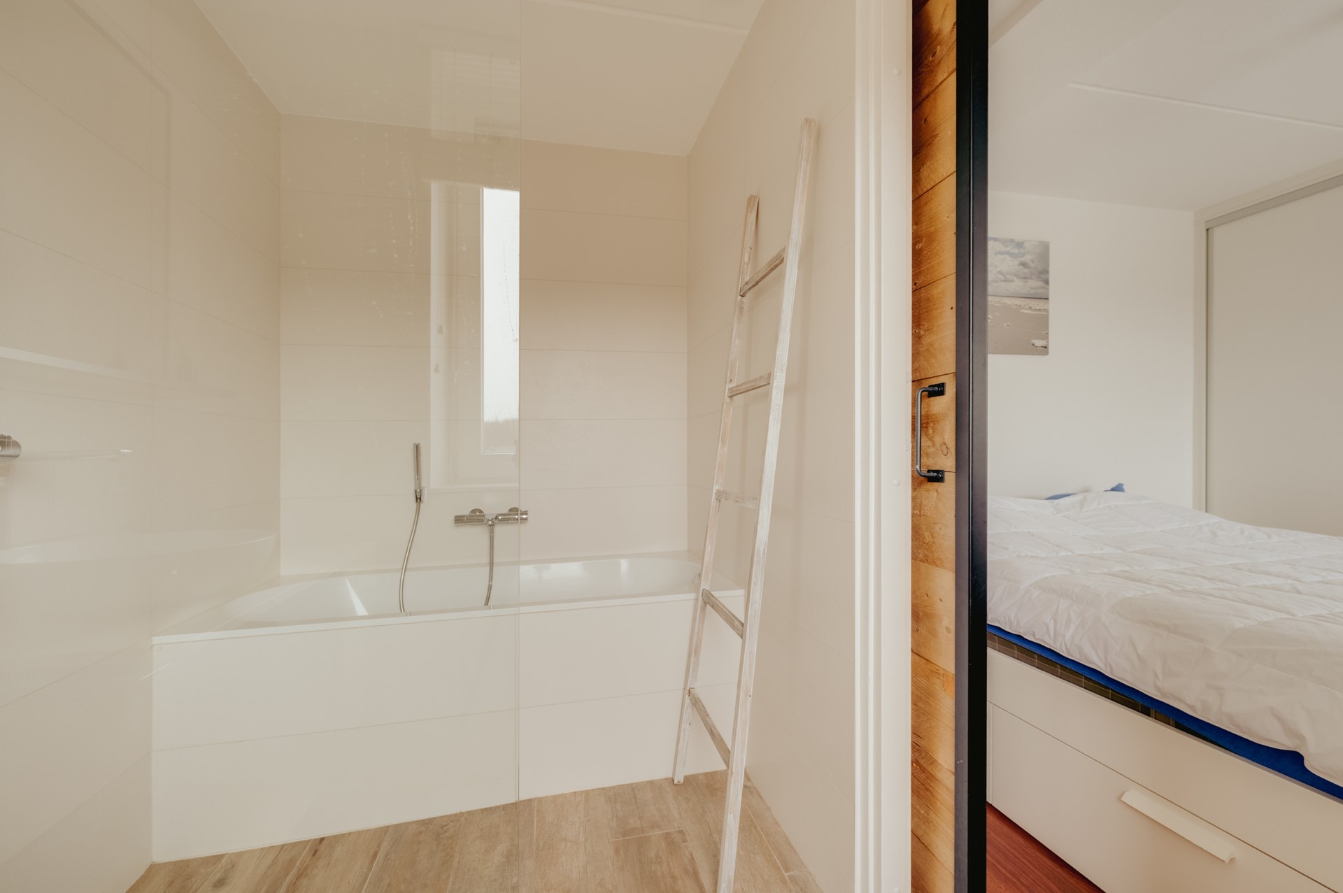 De slaapkamer is rustig gelegen en beschikt over vaste kastruimte. Via een stijlvolle schuifdeur is de moderne en recent gerenoveerde badkamer bereikbaar. Deze is voorzien van een ligbad, separate douche en een eigentijds wastafelmeubel.