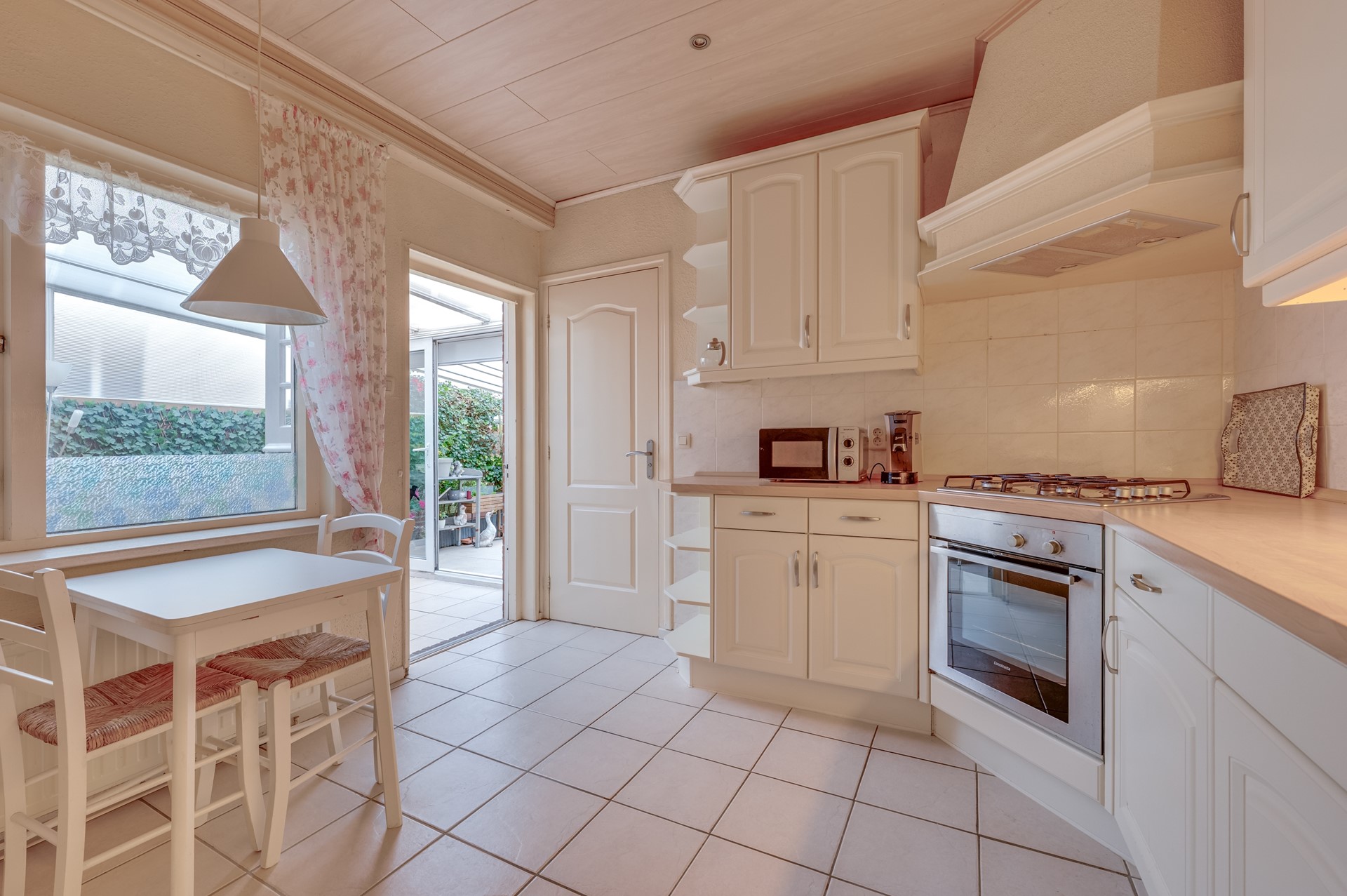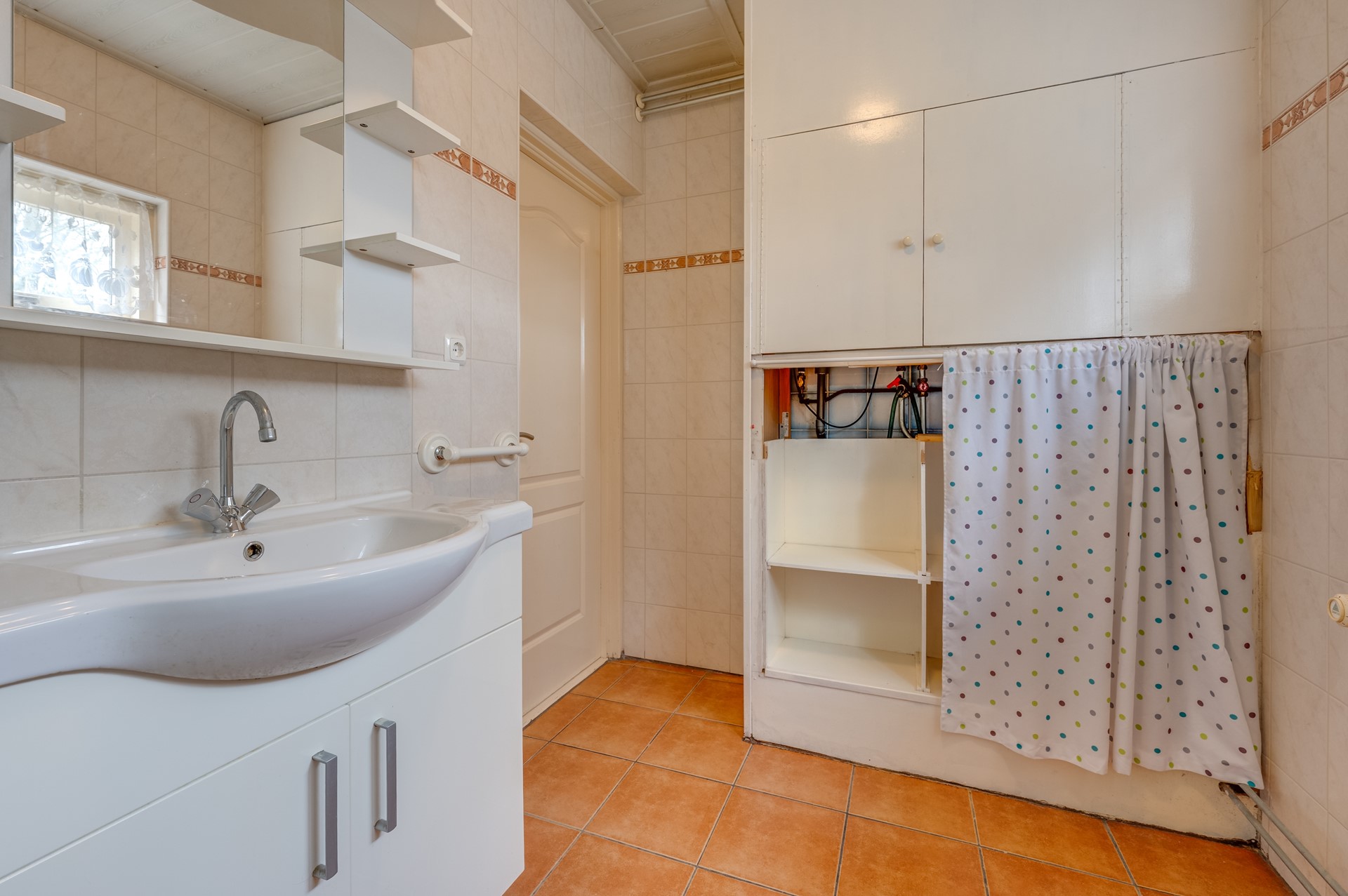 Aansluitend bevindt zich de keuken, praktisch ingericht en met verbinding naar de eetkamer. Vanuit de keuken heeft u toegang tot de badkamer, die zich op de begane grond bevindt en is voorzien van toilet, douche en wasmeubel.