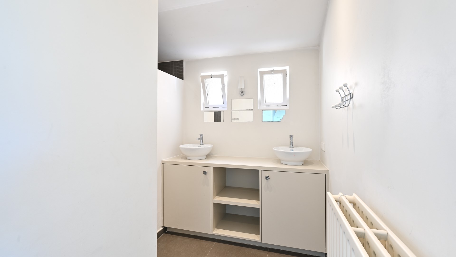 De woning beschikt daarnaast over een nette badkamer, voorzien van een dubbele wastafel met meubel en een ruime inloopdouche, uitgevoerd in een stijlvolle afwerking.